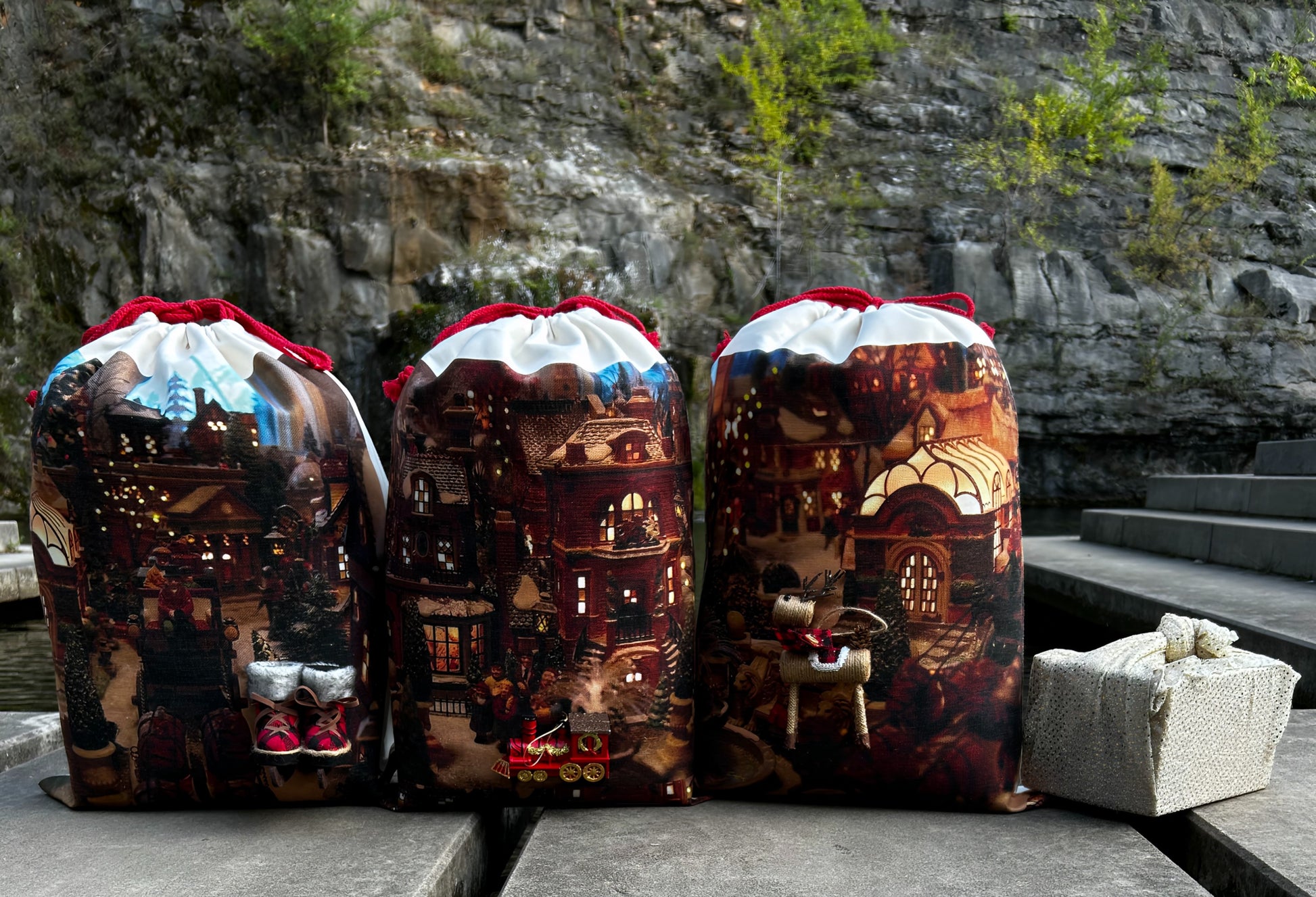 Celebrate the season with our exclusive holiday linen gift bags, each featuring a unique winter village scene and a hand-selected ornament. Designed for beauty, durability, and reusability—perfect year after year.